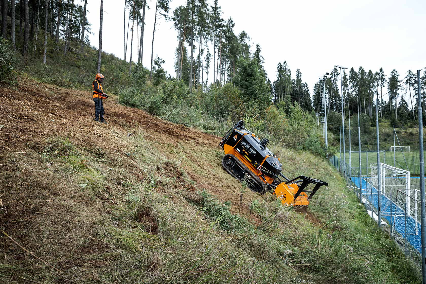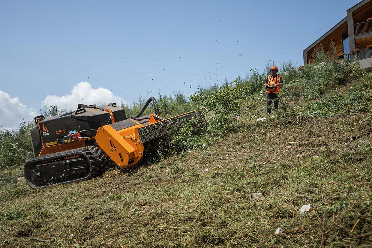 Модель RCU75 може працювати на крутих схилах до 55 градусів. Надпотужна ходова частина оснащена гідравлічною системою зміни ширини колії гусениці з 2 незалежними ходовими рамами для максимальної стійкості на крутих ділянках. Високопрофільні гумові або сталеві гусениці в поєднанні з багатороликовою системою ходової частини забезпечують неперевершене зчеплення з поверхнею. Подвійна гідростатична трансмісія полегшує управління тягою та навісним обладнанням. Оснащена дорожньою фрезою RPL/SSL-45, RCU75 може використовуватися для фрезерування асфальту та бетону на глибину до 17 см.